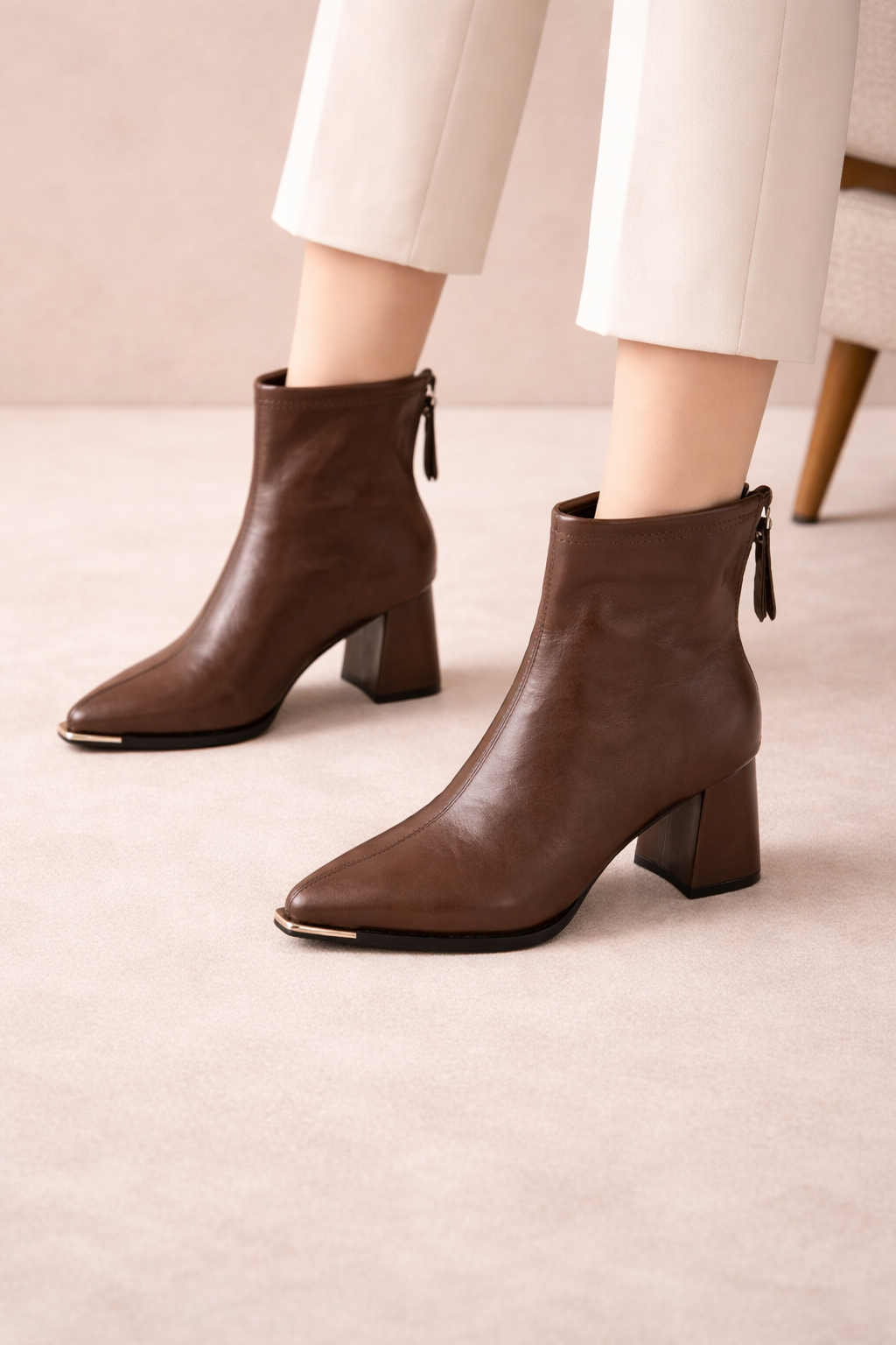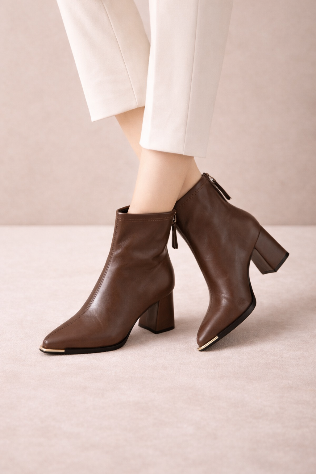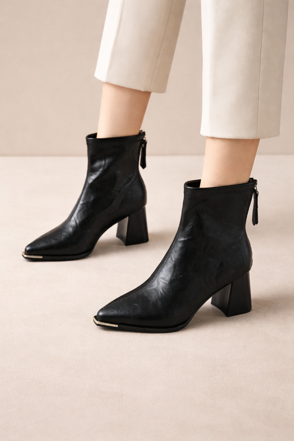 Deze enkellaarsjes voor dames hebben een gestroomlijnd, uitgebalanceerd silhouet voor urban looks met een strakke, tijdloze esthetiek. Het spitse teenontwerp verlengt de voet visueel en behoudt een ingetogen aanwezigheid voor gemakkelijk dagelijks dragen met gestructureerde of vloeiende outfits.