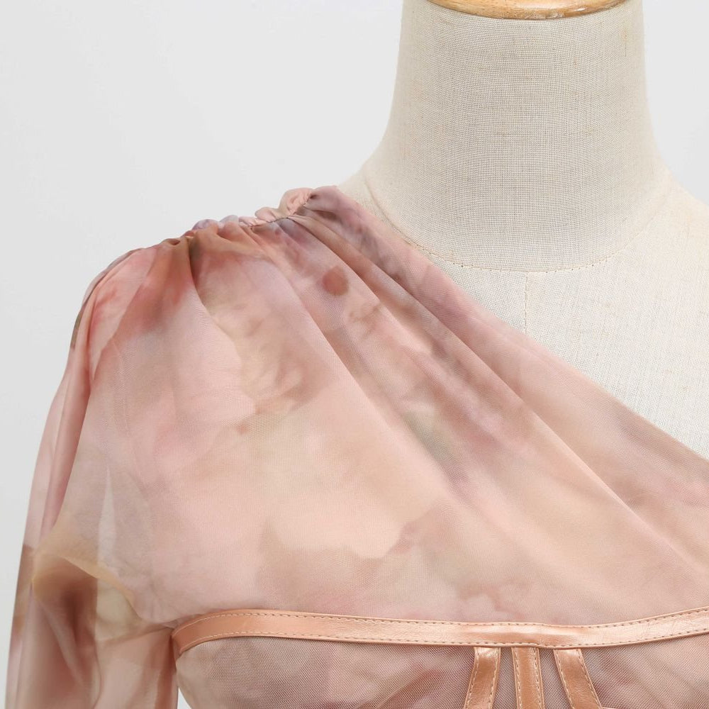 Feestjurk voor dames, ontworpen voor speciale evenementen en formele gelegenheden. De jurk is gemaakt van lichtgewicht, semi-transparante stof met een vloeiende drapering en biedt een comfortabel gevoel en soepele loopbeweging. Het one-shoulder ontwerp met lange mouwen zorgt voor een stabiele pasvorm en elegante afwerking.
