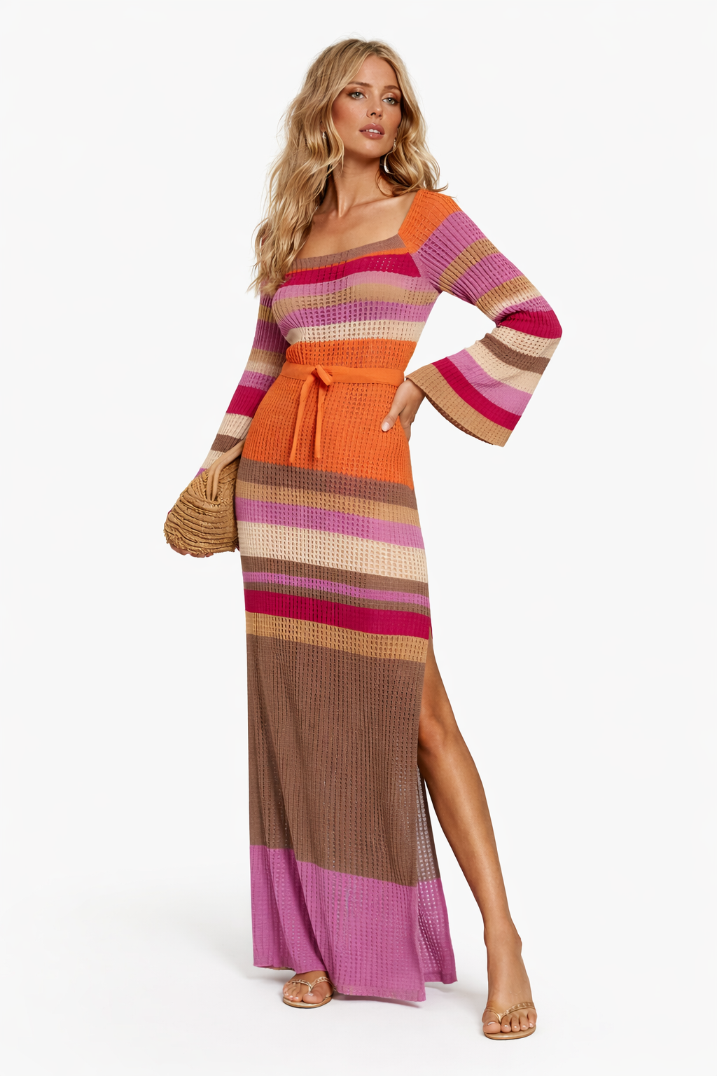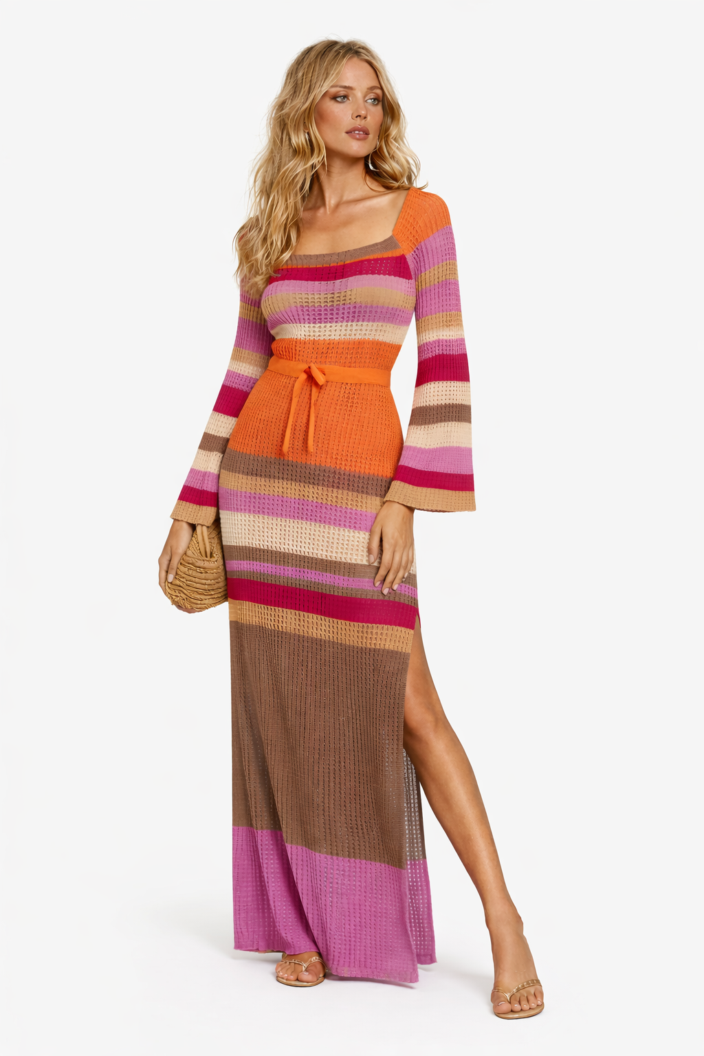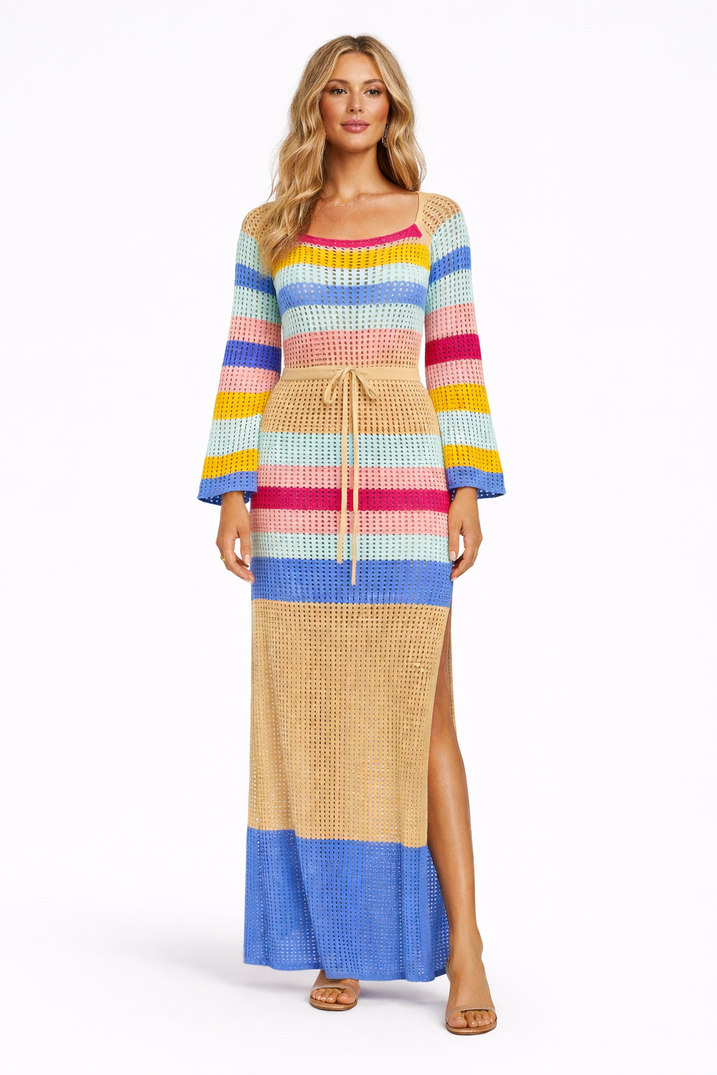 Lange strandjurk voor dames in lichtgewicht opengewerkte stof, ontworpen voor warm weer en dagelijkse zomerdracht. Het ontwerp zorgt voor een goede ventilatie en een vloeiende drapering die de hele dag comfortabel is. De rechte halslijn zorgt voor een eenvoudige, gemakkelijk te dragen lijn, geschikt om over een zwempak te dragen.