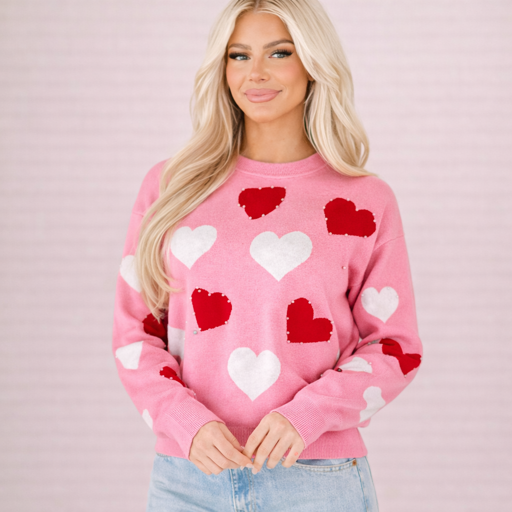 Het ontwerp bevat een repeterend hartpatroon verdeeld over het hele oppervlak van het shirt, inclusief de voorkant, achterkant en mouwen. De motieven zijn gelijkmatig aangebracht en behouden dezelfde afwerking over het hele kledingstuk. Het breisel is van gemiddelde dikte, geschikt voor dagelijks gebruik tijdens warme of koude seizoenen.