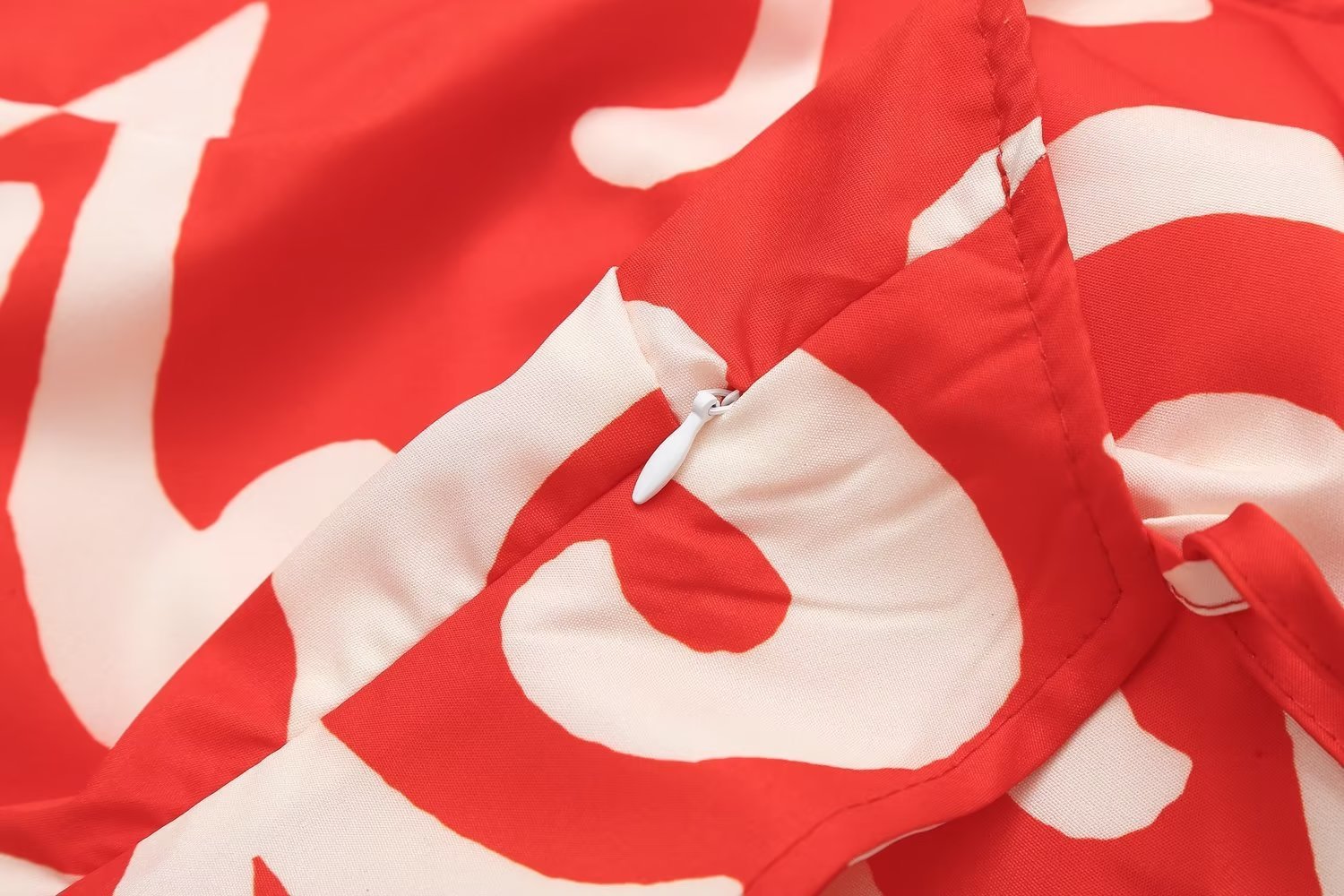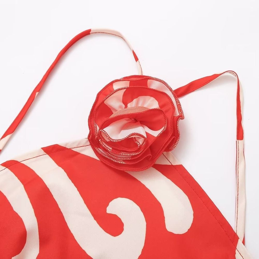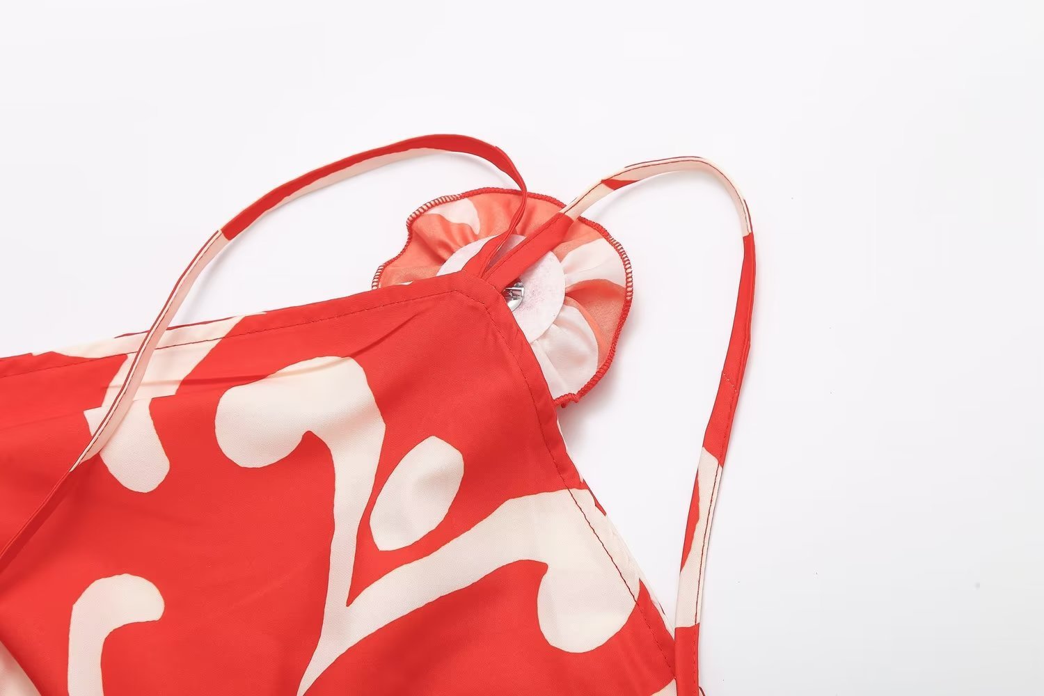 De jurk heeft een halstersilhouet halverwege de lengte en valt recht van de halslijn tot aan de zoom. De halslijn wordt gerimpeld door dunne bandjes en maakt de schouders vrij, terwijl het lichaam een doorlopend volume behoudt. Het oppervlak is bedekt met een doorlopende bloemenprint.