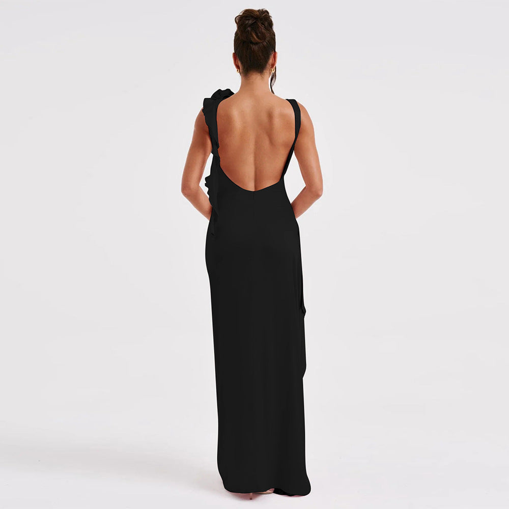 Lange damesjurk van lichtgewicht satijnen stof, ontworpen voor speciale gelegenheden en formele evenementen. Het materiaal voelt zacht aan en valt vloeiend over het lichaam terwijl je loopt. De gesloten, mouwloze halslijn zorgt voor een strakke lijn aan de bovenkant en houdt het ontwerp in balans.