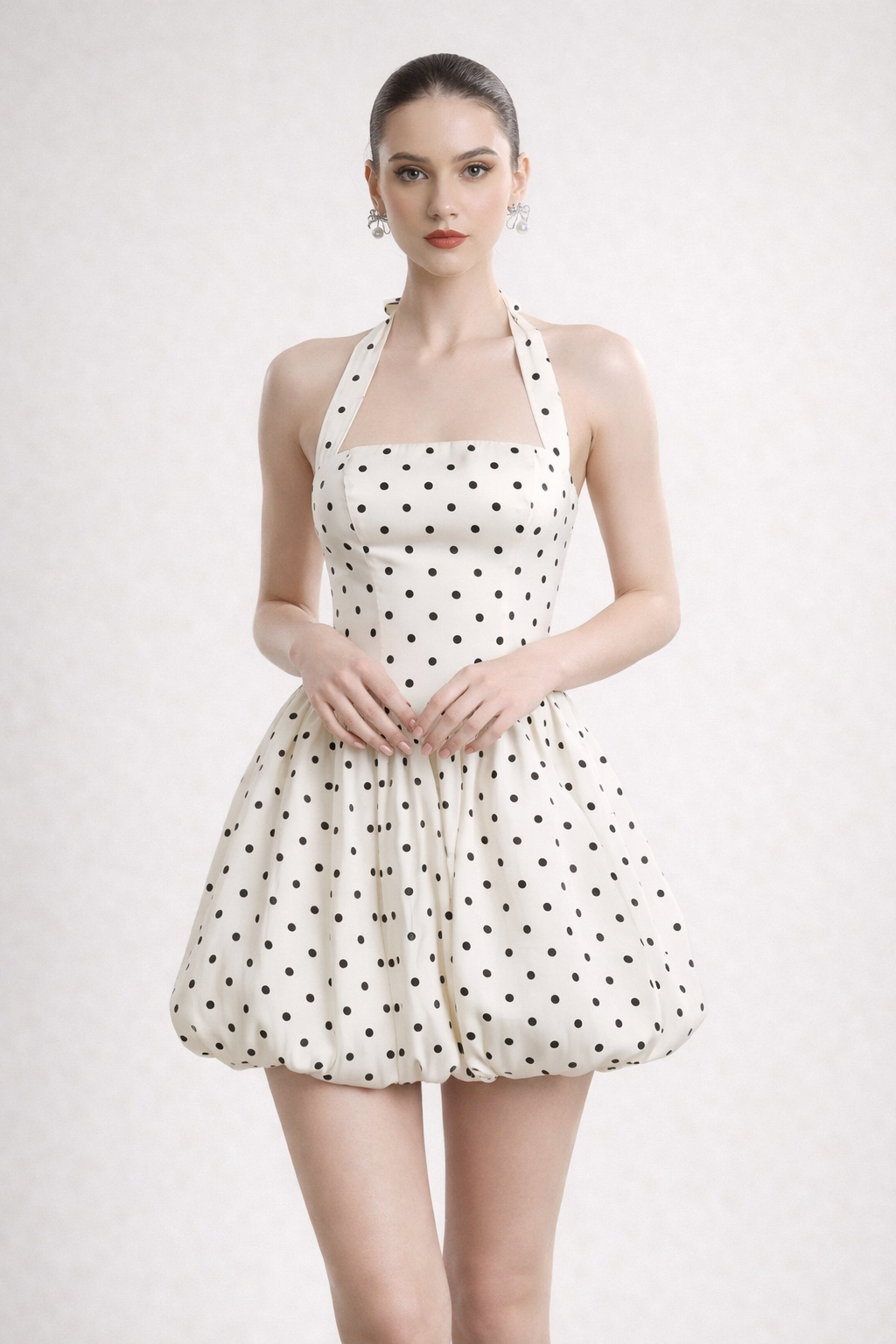 De korte, volumineuze ballonrok geeft beweging en een andere afwerking aan de wandeling. De getailleerde snit vormt het figuur op natuurlijke wijze, terwijl de gerimpelde zoom een ronde vorm creëert die de jurk body geeft zonder hem te verzwaren.