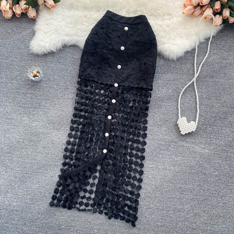 Deze lange rok combineert elegantie en vakmanschap. Hij is gemaakt van delicaat bloemenkant en heeft een semi-transparante structuur met driedimensionale applicaties en een rij knopen aan de voorkant. Het contrast tussen de strak geweven stof aan de bovenkant en het open borduursel aan de onderkant creëert een geraffineerd silhouet met karakter. Ideaal voor speciale evenementen of zomerse stijlen met een romantische flair.