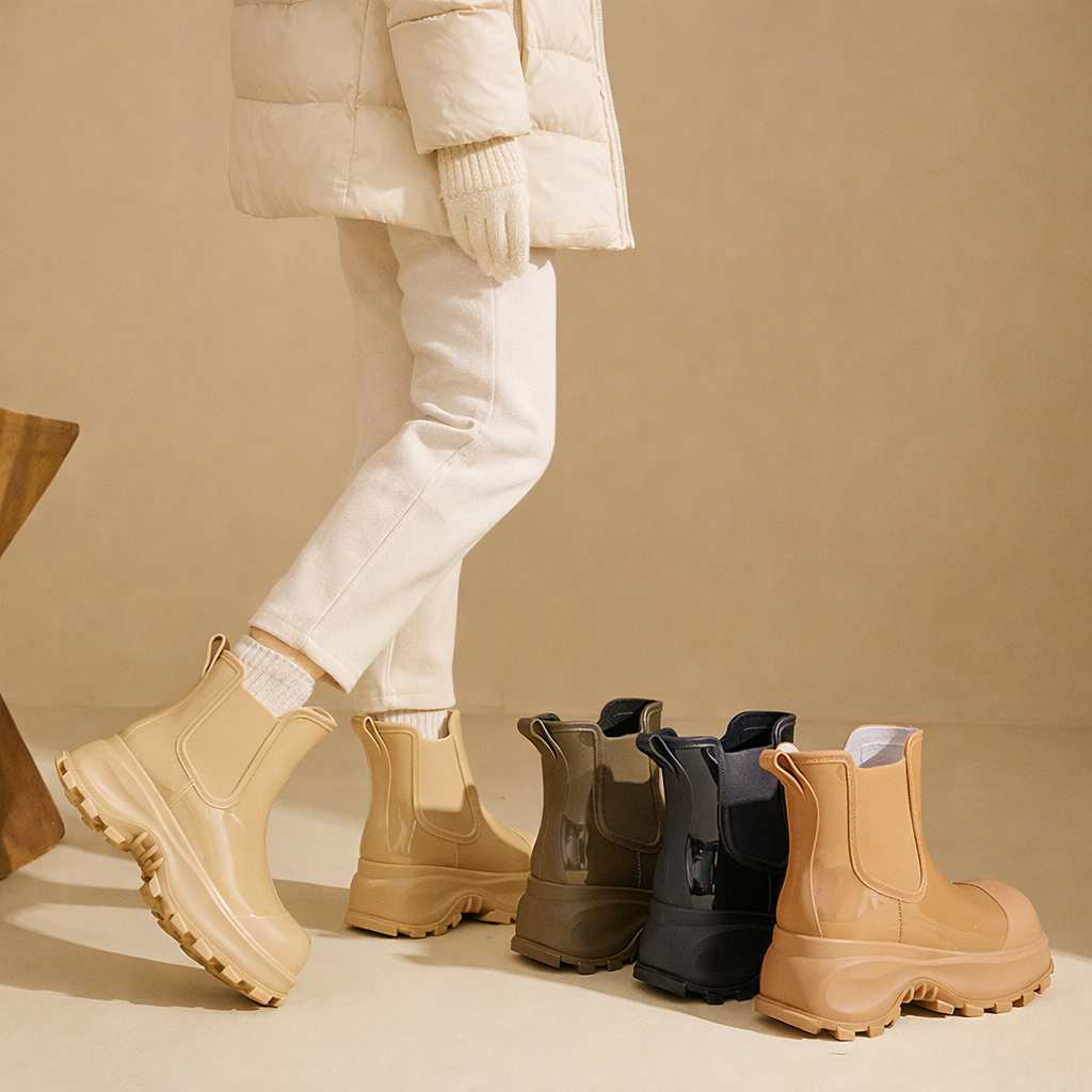 Tijdens het dragen voelt de voet stabiel en veilig aan, dankzij de verhoogde voet die geschikt is voor natte oppervlakken. De lichtgewicht constructie maakt langdurig dragen mogelijk zonder stijfheid en past gemakkelijk in stedelijke routines tijdens het regenseizoen.