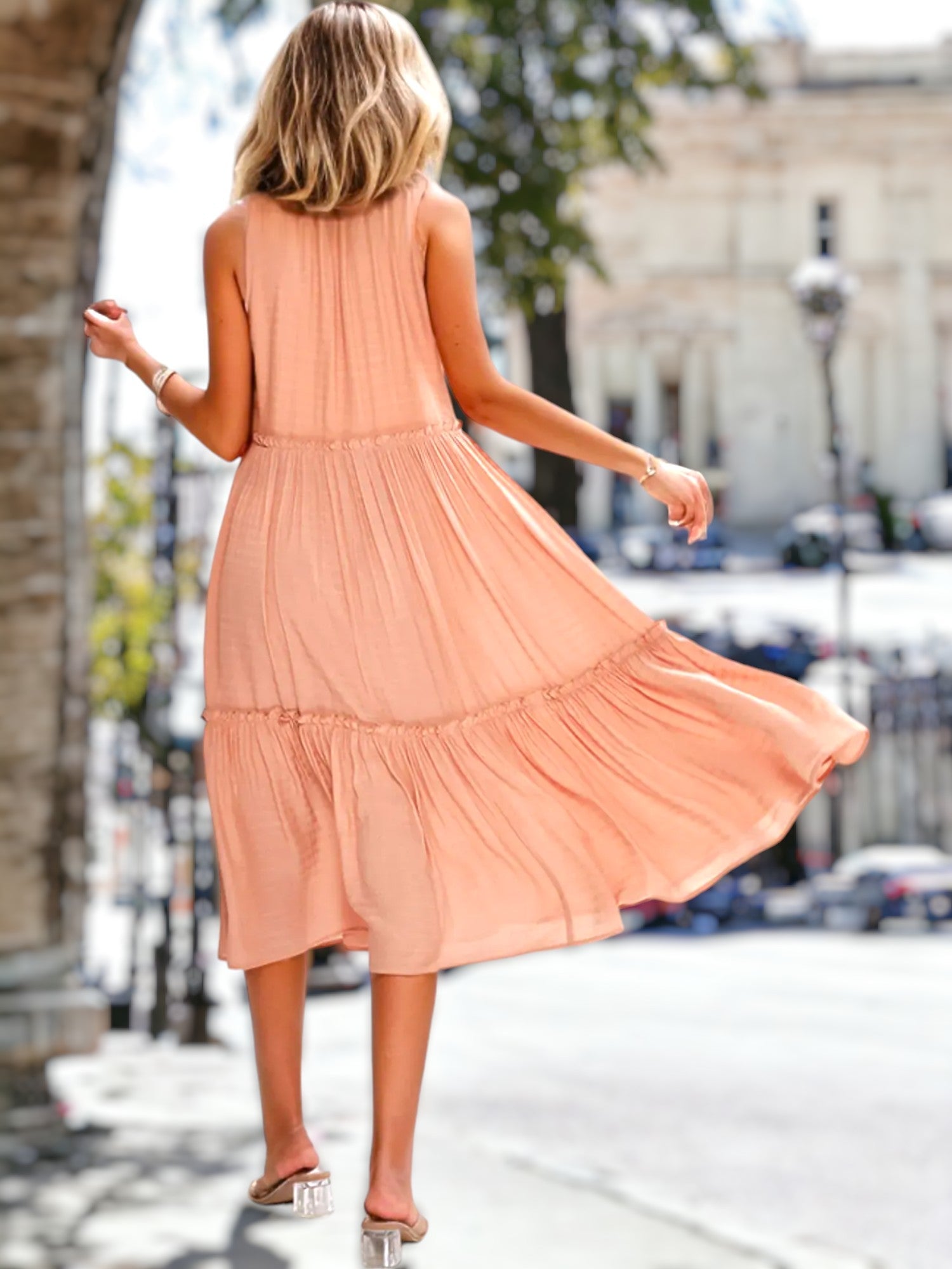 Deze prachtige effen jurk heeft een gelaagd ontwerp voor beweging en stijl. De jurk heeft een V-hals met strikdetail, een recht model en is mouwloos voor een frisse, moderne look. Door de lengte tot onder de knie is het ideaal voor verschillende gelegenheden, van casual uitjes tot speciale evenementen. Combineer met een hoofdband en sandalen voor een charmante look.